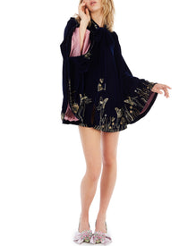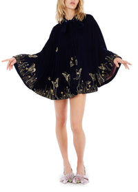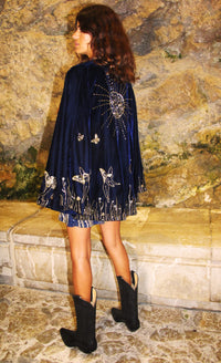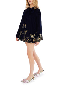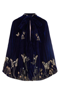 This velvet dark blue cloak is embroidered with the pattern of a fairy perched on a mushroom under the moonlight.