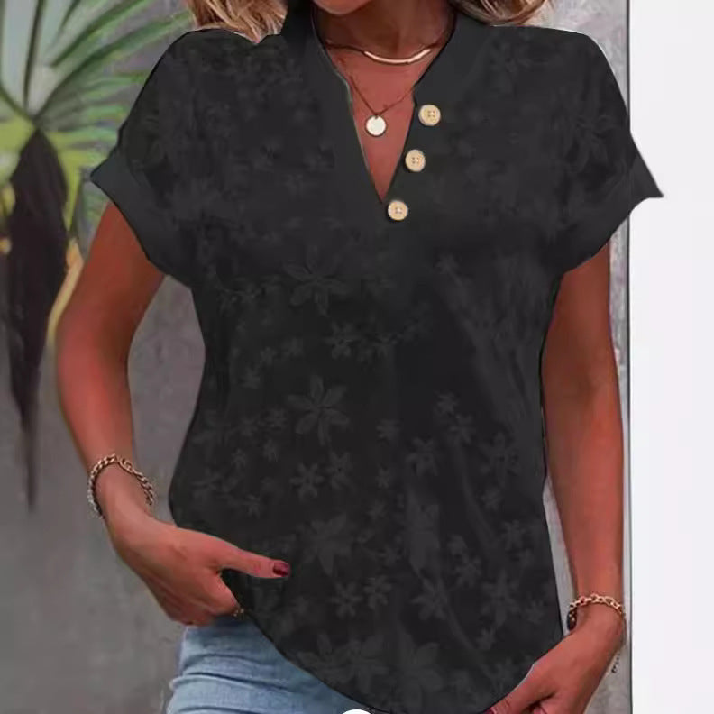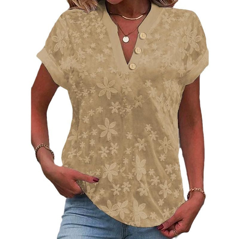 Women's Embroidered V-neck Short Sleeve Button Shirt