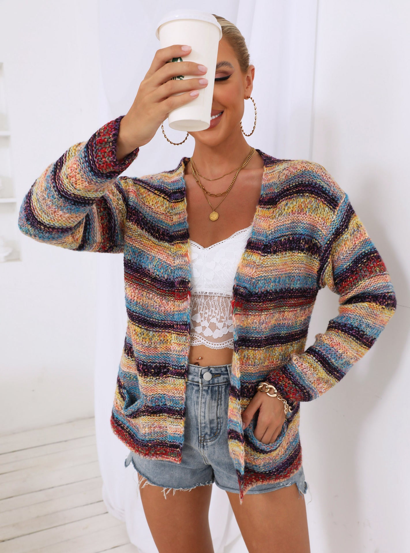 Women's Jacket Mixed Color Striped Woven Warm Jacket Double Pocket Buttonless Sweater Cardigan
