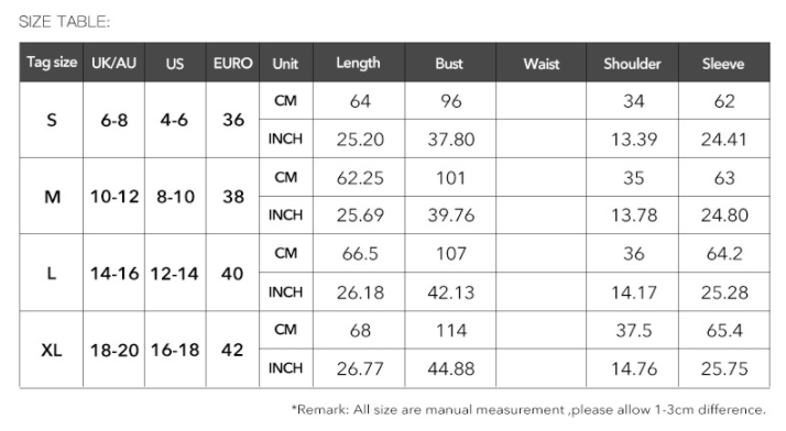 1. Asian sizes are 1 to 2 sizes smaller than European and American people. Choose the larger size if your size between two sizes. Please allow 2-3cm differences due to manual measurement. 2. Please check the size chart carefully before you buy the item, if you don't know how to choose size, please contact our customer service. 3.As you know, the different computers display colors differently, the color of the actual item may vary slightly from the following images.